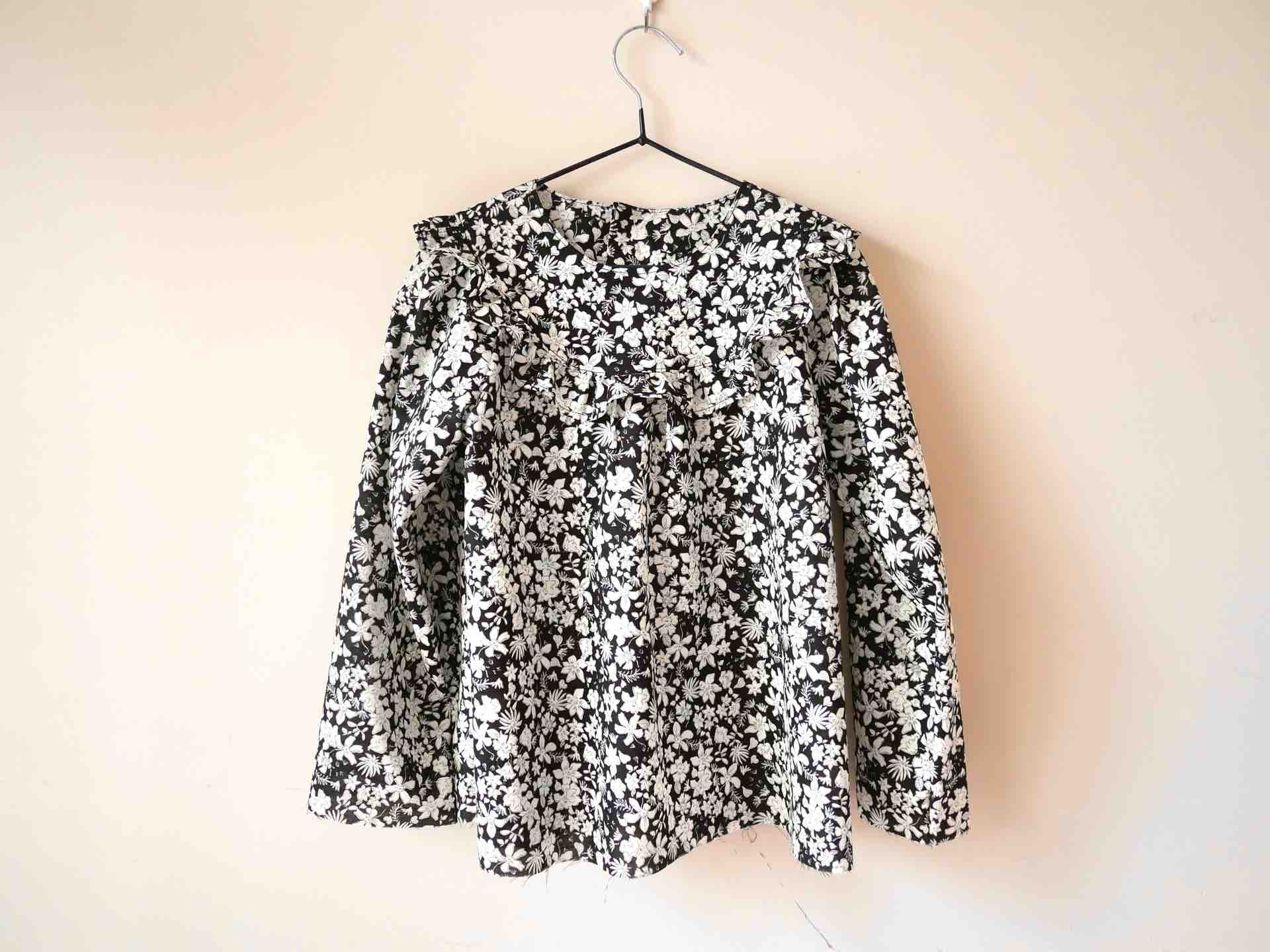 ラウンドヨークとフリルがポイントのブラウス。